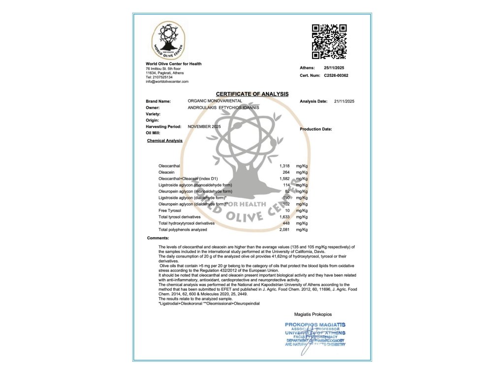 Řecký extra panenský olej nejvyšší kvality registrovaný v několika EU zemích jako lék na předpis. Když zmíníme polyfenoly, napadne mě jednoznačně Pamako. Tento olej je ideální používat denně jako lék, neboť obsahem polyfenolů, skvalenu a jiných látek patří mezi absolutní světový vrchol. V současné sezóně je to úžasných 2081 mg/kg, z toho oleocanthal 1318 mg/kg!.